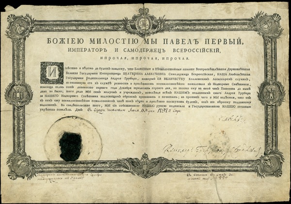 Emperor of Russia (born 1754) from 1796 until his assassination in 1801. A champion of the poorer classes, his sweeping reforms alienated the Russian nobility and were thought to have provided a prime motivation for the conspiracy that led to his brutal death. Engraved DS on parchment, in Russian, one page, 16 x 11, 1797. An untranslated official document, evidently an appointment or commendation. A remnant of the wax seal remains at lower left. In fair condition, with soiling, wrinkling, scattered staining, tears (tape repaired from reverse), and signature on the light side. R&R COA.