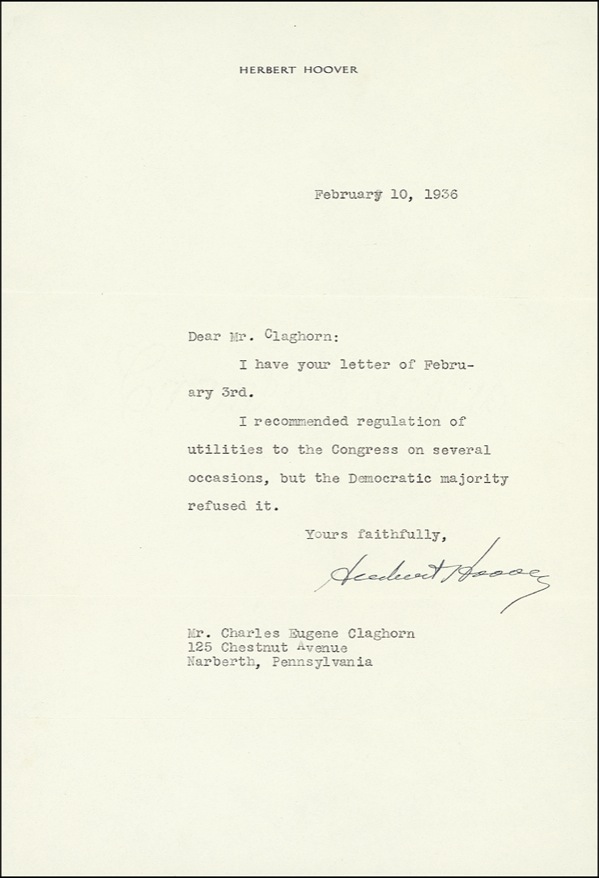 TLS, one page, 7.25 x 10.5, personal letterhead, February 10, 1936. Letter of response to a gentleman in Pennsylvania. In part, “I recommended regulation of utilities to the Congress on several occasions, but the Democratic majority refused it.” Accompanied by the original mailing envelope. In very fine condition, with three horizontal folds. LOA John Reznikoff/PSA/DNA and R&R COA.