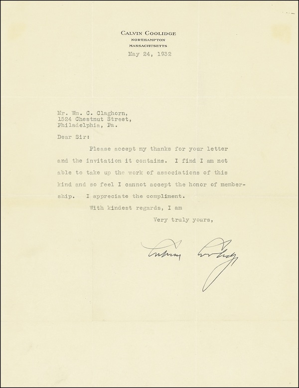 TLS, one page, 8.5 x 11, personal letterhead, May 24, 1932. Letter to William Claghorn, declining a membership to an unidentified group. In part, “I find that I am not able to take up the work of associations of this kind and so feel I cannot accept the honor of membership. I appreciate the compliment.” In fine condition, with intersecting mailing folds and a touch of light toning. LOA John Reznikoff/PSA/DNA and R&R COA.