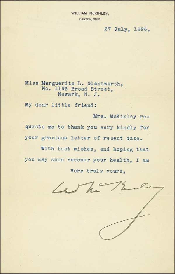 TLS signed “W. McKinley,” one page, 5.5 x 8.5, personal letterhead, July 27, 1896. Letter of gratitude to a child. In full, “Mrs. McKinley requests me to thank you very kindly for your gracious letter of recent date. With best wishes, and hoping that you may soon recover your health.” In very good condition, with scattered light creasing and wrinkling, light mirroring of text and small tape repair to reverse. LOA John Reznikoff/PSA/DNA and R&R COA.