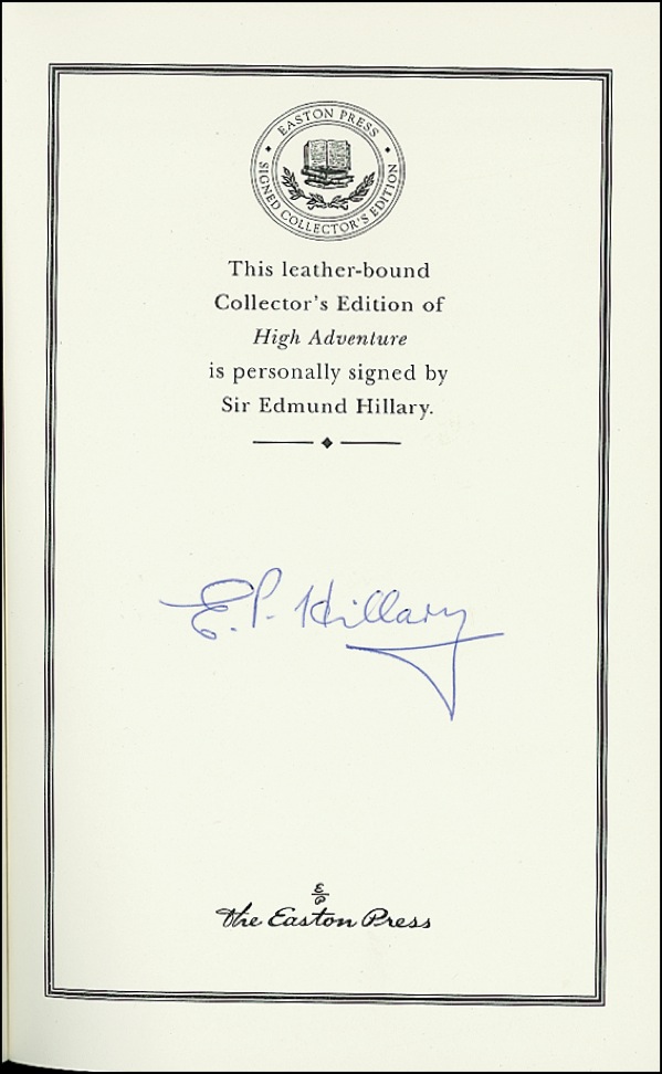 Signed book: High Adventure. “Collector’s edition.” Norwalk: Easton Press, 2003. Leather-bound hardcover, 6.5 x 9.5, 246 pages. Signed in ballpoint on a specially printed prefatory page, “E. P. Hillary.” In very fine condition. R&R COA.