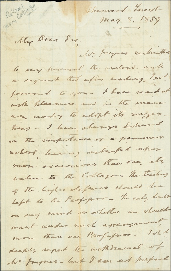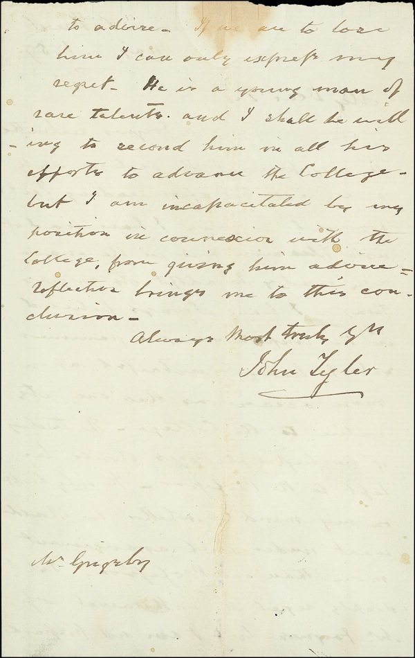 ALS, one lightly lined page both sides, 5 x 7.5, May 8, 1859. Tyler writes to Mr. Grigsby regarding a book sent to him by another gentleman. In part: “I have read it with pleasure and in the main am ready to adopt its suggestions. I have always believed in the importance of a grammar school, hence my interest upon more occasions than one, its value to the College [William and Mary, his alma mater, of which he was an active supporter]. The only doubt in my mind is whether we should want under such engagement more than one professor.” Accompanied by an attractive unsigned period portrait engraving. In very good condition, with scattered toning and spotting, heavy central vertical fold, and subtle show-through. LOA John Reznikoff/PSA/DNA and R&R COA.