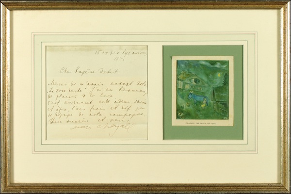 Russian-born artist (1887–1985) whose colorful, fanciful depictions of peasant life, Judaica, and other subjects earned him a place among the most popular visual artists of the twentieth century. ALS in French, one page, 5.25 x 5.25, no date. Untranslated letter written to a friend, signed at the conclusion, “Marc Chagall.” Matted and framed with a book photo of his work entitled The Green Eye, to an overall size of 14.75 x 10. In fine condition, with horizontal mailing folds affecting tops of a couple letters of signature and light toning along top edge. R&R COA.
