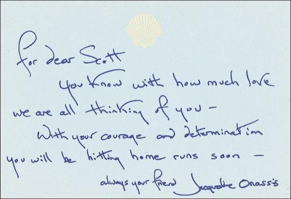 ALS, one page, 5 x 3.25, no date (circa 1993). Brief letter to her riding instructor, recovering from surgery. In full, “You know with how much love we are all thinking of you. With your courage and determination you will be hitting home runs soon.” Accompanied by the original transmittal envelope and two original color 4 x 6 photos of Kennedy on horseback. In very fine condition. R&R COA.