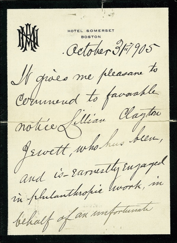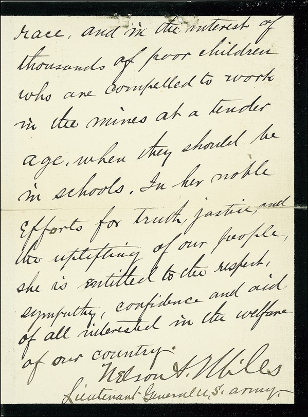 American soldier (1839–1925) who earned a niche in military history as the only man to serve as an officer in the Civil War, Indian Wars, and Spanish-American War. Though the nearly eighty-year-old Miles volunteered to serve during World War I, his offer was declined by Woodrow Wilson. ALS signed “Nelson A. Miles, Lieutenant General U.S. Army,” two pages on two adjoining sheets, 4.75 x 6.5, black-bordered Hotel Somerset letterhead, October 31, 1905. Letter to Miss Lillian Clayton Jewett of Boston reads in full, “It gives me great pleasure to commend to favorable notice Lillian Clayton Jewett, who has been, and is-earnestly engaged in philanthropic work, in behalf of an unfortunate race, and in the interest of thousands of poor children who are compelled to work in the mines at a tender age, when they should be in schools. In her noble efforts for truth, justice, and the uplifting of our people, she is entitled to the respect, sympathy, confidence and aid of all interested in the welfare of our country.” Accompanied by the original mailing envelope. Jewett gained national attention when she set out to help the family of Frazier Baker, an African- American postmaster in the town of Lake City, South Carolina who was killed along with his daughter after a mob attacked his home and post-office. African-American anti-lynching advocates considered asking the family to leave Charleston where they lived awaiting the outcome of the trial. Jewett came to their rescue after learning the family was in dire straits. Against the wishes of many of the city’s black elite, Jewett secretly boarded a train heading south. In Charleston she convinced the Bakers of her good intentions, and the family agreed to accompany her. Jewett’s African-American supporters in the North likened her to Harriet Beecher Stowe. Jewett appeared with the Bakers before large gatherings in Rhode Island, Massachusetts, and Maine. Holding up the family’s suffering as an object lesson against lynching, she strongly denounced President McKinley for his failure to take a public stand against mob rule in the South. R&R COA.