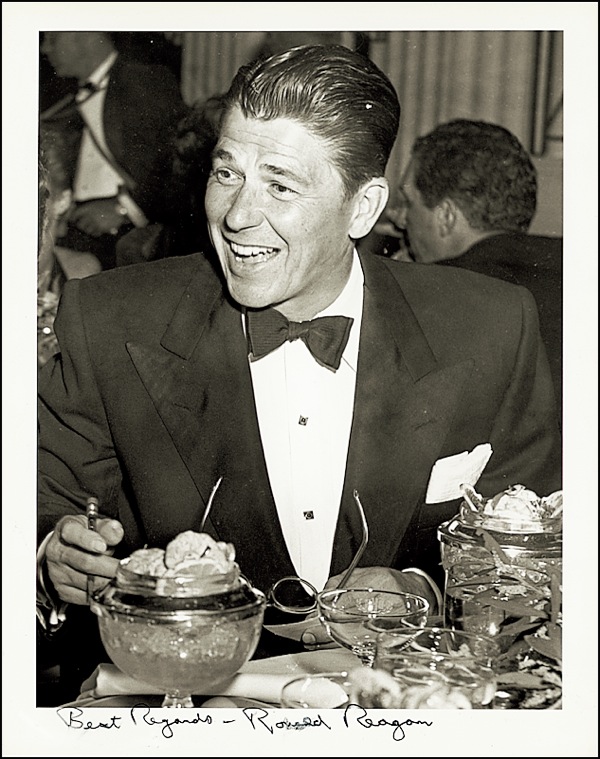 Satin-finish 8 x 10 photo of Reagan at a formal dinner, signed in black felt tip, “Best Regards, Ronald Reagan.” Faint brushing to inscription and smudge to first name, otherwise fine condition. R&R COA.