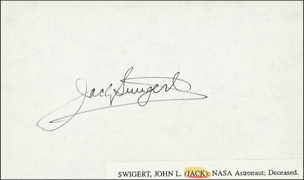 NASA astronaut (1931–1982) who, as a last-minute replacement for Ken Mattingly (who had been exposed to German measles) was one of three crew members on the near-disastrous Apollo 13 mission. After becoming embroiled in the controversy surrounding souvenirs carried aboard the Apollo 15 mission, Swigert embarked on a political career, running unsuccessfully for a Senate seat in 1978. He finally won a seat in the House of Representatives in 1982 but died before taking the oath of office. Ink signature, “Jack Swigert,” on an off-white 5 x 3 slip. In fine condition, with small caption taped to bottom edge and a few stray ink marks to right of signature. COA Scott Cornish and R&R COA.
