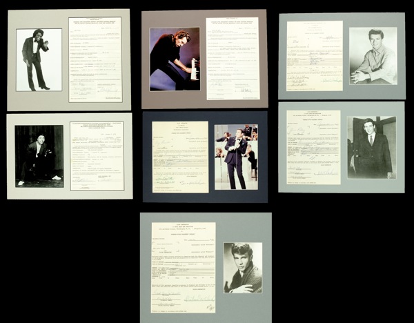 Ten contracts for various personal and television appearances, including several for American Bandstand, 1960–1974, each signed by the respective artist. Those related to American Bandstand are also signed by Dick Clark. Represented: Johnny Madera (AB), Bobby Rydell (AB; as Robert Louis Ridarelli), James Brown, Little Richard (as Richard Penniman), Jerry Lee Lewis, Tony Bennett (AB), Gene Pitney (AB), Dion DiMucci (AB), Adam Wade (AB), and Anita Bryant (AB). Seven of the items are individually matted with unsigned photos. In fine condition, with a few spots to Little Richard (away from signature). R&R COA.