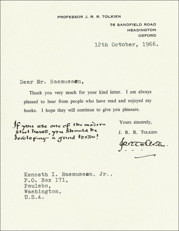 British author and scholar (1892–1973) whose Lord of the Rings trilogy became one of the towering classics of fantasy literature and inspired a series of successful and wildly popular films. TLS, one page, 5.25 x 7, personal letterhead, October 12, 1966. A letter of thanks to a fan. After signing, Tolkien adds in his distinctive calligraphic hand, “If you use one of the modern steel bows, you should be developing a good torso!” Fans of Tolkien’s work will note that “steel bows” were used by the Numenor race in Lord of the Rings. Accompanied by the original mailing envelope. In fine, clean condition. LOA John Reznikoff/PSA/DNA and R&R COA.