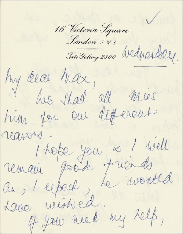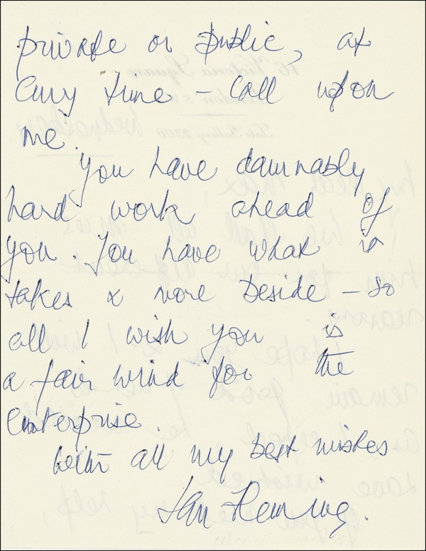 Former British intelligence officer (1908–1964) whose novels featuring suave spy James Bond have attained unprecedented and seemingly indestructible popularity in more than twenty film adaptations over the course of four decades. Scarce ALS, one page both sides, 5.5 x 7, personal letterhead, no date [June 1964]. Fleming writes to Max, the son of British-Canadian politician and business tycoon Lord Beaverbrook (1879–1964), who died on June 9, 1964. In full: “We shall all miss him for our different reasons. I hope you & I will remain good friends as, I expect, he would have wished. If you need my help, private or public, at any time—call upon me. You have damnably hard work ahead of you. You have what it takes & more beside—so all I wish you is a fair wind for the enterprise. With all my best wishes....” Fleming’s relationship with Lord Beaverbrook began in 1957, when the Daily Express, owned by Beaverbrook, approached Fleming about comic strip adaptations of the popular James Bond novels. Though Fleming was originally reluctant—he worried that “unless the standard of these books is maintained they will lose their point”—he finally assented, and the first Bond strip, Casino Royale, was published in the following year. Friction between Fleming and Beaverbrook developed in 1962, when the latter discovered that Fleming had sold the rights to the novel The Living Daylights to one of Beaverbrook’s biggest competitors, the Sunday Times. This seeming lack of loyalty incensed Beaverbrook so thoroughly that he broke off his business relationship with Fleming, even terminating the strip Thunderball while it was still in mid-story. The two ultimately mended their relationship, and the series resumed in 1964, the year of Beaverbrook’s death, with On Her Majesty’s Secret Service. In very fine, clean condition. Handwritten letters from Fleming, let alone fully signed examples with a personal association of such significance, take a place among the prized scarcities of modern fiction. LOA John Reznikoff/PSA/DNA and R&R COA.