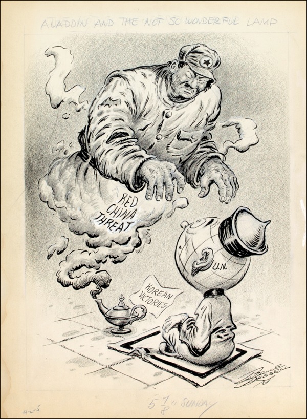 American cartoonist (1903–1963) who won the Pulitzer Prize for Editorial Cartooning in 1946. Original artwork for a one-panel political cartoon titled “Aladdin and the Not-So-Wonderful Lamp,” depicting a spectral Red Chinese soldier looming over a personified United Nations as he emerges from a genie lamp titled “Korean Victories,” ink and crayon on textured artist’s cardstock, 16.5 x 22, late 1940s–early 1950s, signed in ink at lower right, “Bruce Russell.” Usual touch-ups with artist’s white-out, editorial notations to margins, and a touch of mild toning and soiling, otherwise fine condition. Tremendous display potential! R&R COA.