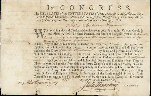 Partially printed DS, one page, 13 x 8.75, May 1, 1777. A document appointing John Jackson, Esquire as “First Lieutenant of a company in the regiment commanded by Henry Jackson, Esquire.” The reverse bears a manuscript discharge for Jackson, signed “W. Heath MG” and dated October 27, 1778. Major General William Heath (1737–1814) participated in the defense of New York City during the Revolution and saw further action at the Battle of Long Island, the Battle of Harlem Heights, and the Battle of White Plains. In very good condition, with two folds and associated small chips slightly touching signature, small holes at intersections of folds, faint scattered spotting and show-through, and entire reverse expertly silked for stabilization. Hancock’s signature is exceptionally bold and dark; military commissions signed by him with the addition of an integral discharge are of the greatest scarcity. LOA John Reznikoff/PSA/DNA and R&R COA.