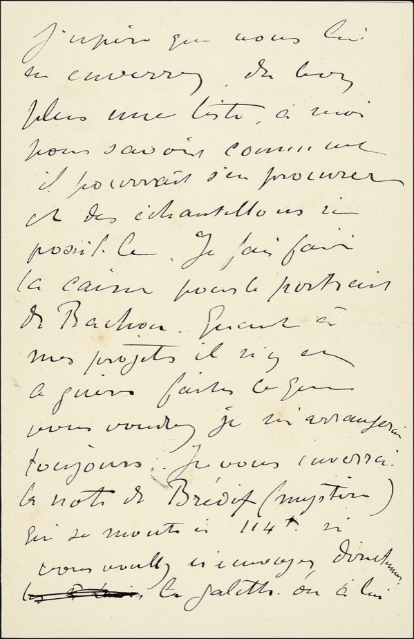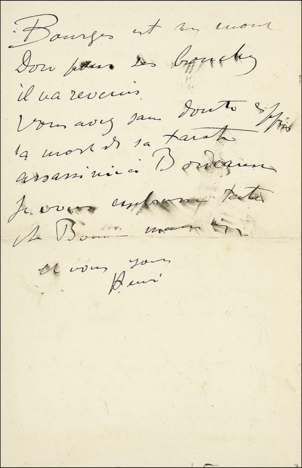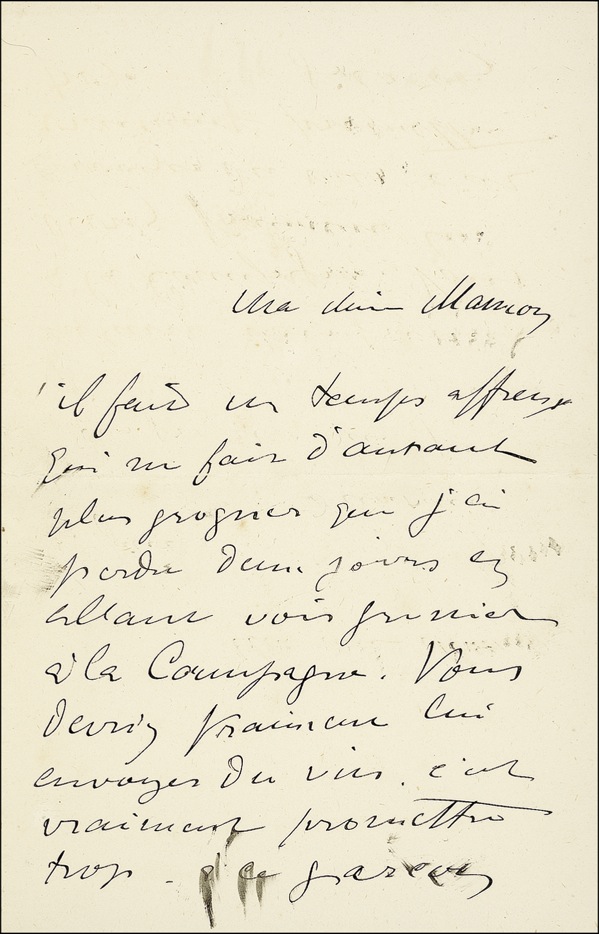 Important French painter and printmaker (1864–1901) whose lively, colorful portrayals of the people and places of fin-de-siècle Paris take a place among the most iconic images of the era. Lautrec’s immersion in art stemmed largely from his isolation following a disfiguring teenage accident that failed to heal properly, preventing his legs from growing further while his torso continued to develop normally. Scarce ALS in French, signed “Henri,” three pages on two adjoining sheets, 4.5 x 7, no date. Lautrec writes to “Ma chère Maman.” In part (translated): “I have lost two days in going to see Prunier in the country, You would be really good to send him some wine which has been promised… I have made the box for the portrait of M. Bachon. Speaking of my projects, I have no projects … do what you have to do, and me, I’m doing what I have to do. I will send you the note from M. Brevit….” Brushing to several words and light offsetting of ink from premature folding, otherwise fine, bright condition. LOA John Reznikoff/PSA/DNA and R&R COA.