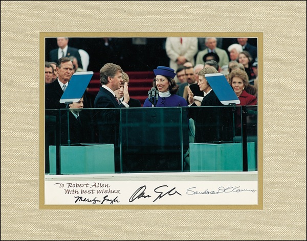 Color satin-finish 10 x 8 photo of Quayle taking the oath of office, signed and inscribed in a calligrapher’s hand “To Robert Allen, With best wishes,” and signed in black felt tip Dan Quayle,” and “Marilyn Quayle,” and in black ink by Sandra Day O’Connor. Double matted to an overall size of 14 x 11. In fine condition, with a couple light creases to bottom border. R&R COA.