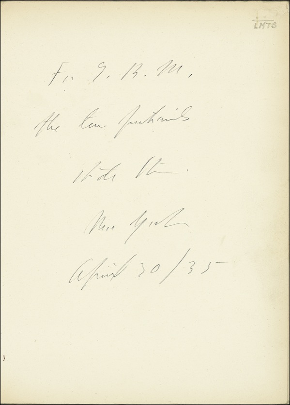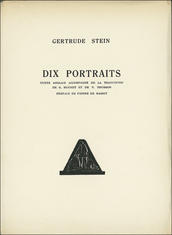 Signed book: Dix Portraits. First trade edition. Paris: Éditions de la Montagne, 1930. Softcover, 6.75 x 9, 85 pages. Signed and inscribed in ink on the front free end page, “To G. B. M., the ten portraits, Gertrude Stein, New York, April 30/35. The pages of the book are unopened. Housed in a custom quarter-leather clamshell box. In fine condition, with a touch of mild wear and toning to edges of covers (small chips to spine ends) and a few of the book’s signatures slightly loose. R&R COA.
