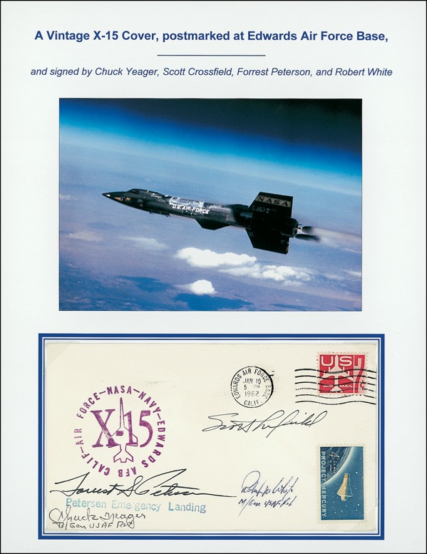 Signed FDC, 6.5 x 3.5, with a cachet honoring the X-15, signed in ink and ballpoint by Chuck Yeager, Scott Crossfield, Forrest Peterson, and Robert White, Yeager and White adding their ranks. In fine condition. COA Scott Cornish and R&R COA.