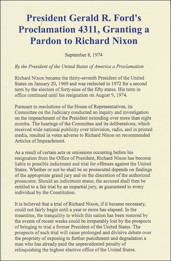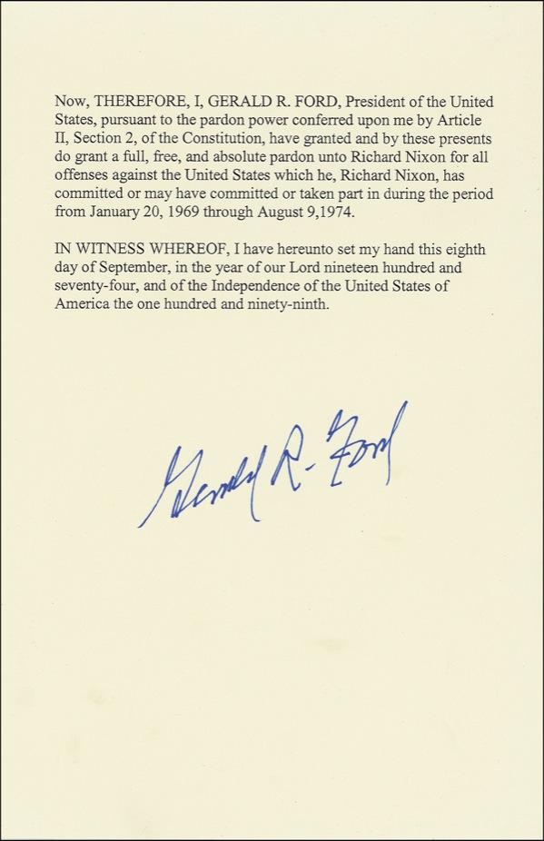 Souvenir typescript of the Nixon pardon, on two tan 5.75 x 9 sheets, signed on the second page “Gerald R. Ford” in blue felt tip. This full transcript includes six paragraphs of the historic pardon. In part: “I, Gerald R. Ford, President of the United States…do grant a full, free, and absolute pardon unto Richard Nixon for all offenses against the United States which he…may have committed or taken part in during the period from January 20, 1969, through August 9, 1974.” In very fine condition. R&R COA.