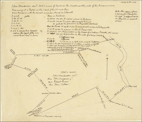 Rare manuscript document in Jefferson’s hand, signed three times in the text as “T. Jefferson” and once as “Jefferson”, one 8.5 x 7.25 page affixed at the edges to a slightly larger sheet, no date [circa 1800–1810]. Jefferson CountryBy the time of his second presidential term, Jefferson increasingly looked forward to a place where he could enjoy “the solitude of a hermit” after decades of public life. Already one of Virginia’s most prominent and prosperous land owners, his considerable holdings then included the ancestral family estate at Shadwell, his own Monticello, and Poplar Forest, inherited from his wife and the future site of his “retirement” home. Jefferson’s “private” endeavors in the first decade of the nineteenth century were largely directed toward further augmenting his real estate interests in the verdant, gently rolling hills of Goochland (now Abermarle) County. Shrewd in business as in politics, and well aware that his celebrity would almost certainly induce a spike in prices, Jefferson employed Peyton Craven, his tenant at Shadwell Farm, as a go-between in a number of land transactions. Among the properties that Jefferson snapped up over a period of years were several that had passed from John Henderson, Sr. (died 1786) to his heirs. Jefferson’s dealings with his Henderson “neighbors” were protracted, complex, and often contentious. Still, by 1811, Jefferson gained control over a large portion of former Henderson property, and he continued to buy more throughout the decade. “Beginning at a poplar on the bank....”The present document delineates a 1,043-acre tract of land “on the southwardly side of the Rivanna River,” evidently in the vicinity of Milton, Virginia, formerly held by “John Henderson, dec[ease]d.” Jefferson includes a note tracing the subsequent ownership of the parcel, from Henderson, Sr. to John Henderson, Jr., Robert Rives, and James Watson. A number of other names labeled as “pointers”—Bennet[t] Henderson (another son of John Sr.), C. L. Lewis, “Priddy,” “Reynolds,” and Jefferson himself, document the owners of adjacent properties. In a note at upper right, Jefferson explains that he has penned “This copy … from a survey of J. Slaughter in 1796” that has been “so defaced as to be illegible in several places.” Though the drawing itself is undated, the documentation of the “original” lands of Henderson, Sr. and multiple references to his heirs support a probable date of 1804–1811, when Jefferson was most actively engaged in the transactions noted above. The precision and clarity of the drawing bear ample testament to Jefferson’s fluency as a draftsman, a skill further evidenced by his surviving architectural designs, schematic drawings for inventions, and surveys of his own undertaking. The text of the survey includes the expected precise measurements and such markers as poplar trees, a scrub oak, and “pointers on side of a large branch.” The document is in fine, clean condition, with mounting as noted and the subtlest hint of scattered soiling and faint spotting. While these points are mentioned in the interest of strict accuracy, the overall appearance is fresh and bright, the visual impact undeniable. To place the significance and rarity of the present document in perspective, one need only note the complete, decades-long absence of comparable examples on the market. References to manuscript specimens of Jefferson’s draftsmanship invariably lead to a handful of institutional collections—the Library of Congress, the historical societies of Massachusetts and Maryland, the University of Virginia—with a very select few remaining in private hands. While material from the pen of this most multifaceted of America’s founding fathers consistently tops the want lists of collectors everywhere, the chance to obtain such an important, splendidly graphic example is an opportunity—perhaps even a privilege—that might best be described as singular. LOA John Reznikoff/PSA/DNA and R&R COA.