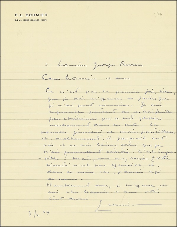 Swiss illustrator and engraver (1873–1941). ALS in French, signed “Schmied,” one lightly lined page, 8.25 x 10.5, personal letterhead, February 9, 1934. Schmied writes to Georges Riviere apologizing for “three errors that slipped nastily through the cracks.” In fine condition, with a few small edge tears and minor bends. R&R COA.