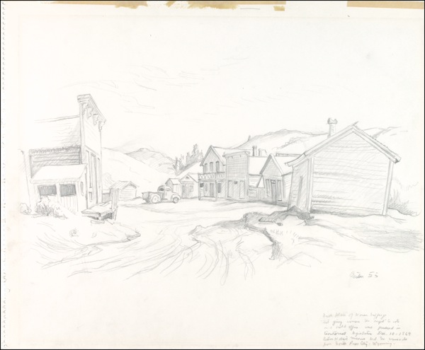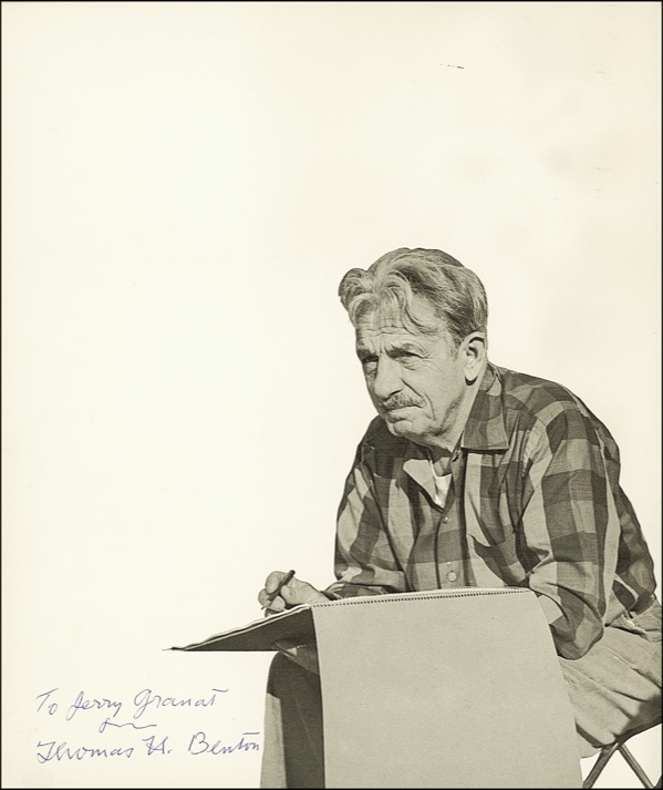 Renowned American artist (1889–1975) whose distinctive “regionalist” style made him one of the most influential figures in American art during the 1930s and 1940s. His large-scale murals, often peopled by lanky, exaggerated human figures, became classic visual emblems of both idyllic rural culture and bustling urbanism in Depression-era America. Four items:Original drawing titled “Ghost Town,” pencil on an off-white 16.75 x 13.75 sheet from the artist’s notebook, signed at lower right “Benton 55.” The drawing depicts a deserted small-town street with the facades of several nineteenth-century commercial buildings and a pickup truck of 1930s–1940s vintage, all against a low mountainous backdrop. Below his signature, Benton adds a handwritten caption: “Birth place of Women Suffrage Act giving women the right to vote and hold office was passed in territorial legislature Dec. 10, 1869. Esther Hobart Morris led the crusade from South Pass City, Wyoming.” Accompanied by an unsigned exhibition label from ACA Galleries in New York. In fine condition, with mounting tape remnants to top margin (well away from image), and the very slightest, nearly imperceptible trace of toning from previous framing.ALS, one page, 7.25 x 10.5, personal letterhead, April 4, 1973. Benton writes to Jerry Granat regarding the above work. In part: “Wymoming [sic] was the first U.S. state to grant woman suffrage. The town depicted in your drawing, now a ghost town, is supposed to be the first place where the proposal of equal voting rights for women was accepted. Anyhow the first territorial legislature (1869) granted women full suffrage. I forget the name of the town but it was near the famed South Pass of the Oregon Trail.” In very good condition, with wrinkles, corner chip, and a few light stains.ALS, one page, 7.25 x 10.5, personal letterhead, April 29, 1973. Benton writes to Jerry Granat. In full: “I will gladly autograph your book of Benton drawings. Send it prepared for return.” In fine, clean condition.Signed book: Benton Drawings. First edition. Columbia: University of Missouri Press, 1968. Hardcover with dustjacket, 10.25 x 12.25, 135 pages. Signed and inscribed in ballpoint on his portrait opposite the title page, “To Jerry Granat from Thomas H. Benton.” The above drawing is reproduced on page 17. Chips and tears to jacket, otherwise fine condition.Though this superb, characteristic image speaks eloquently for itself, the unusually thorough level of documentation, direct from the artist, adds an undeniable cachet shared by few other examples from Benton’s pencil. An exceptional treasure from this seminal figure in American art! LOA John Reznikoff/PSA/DNA and R&R COA.
