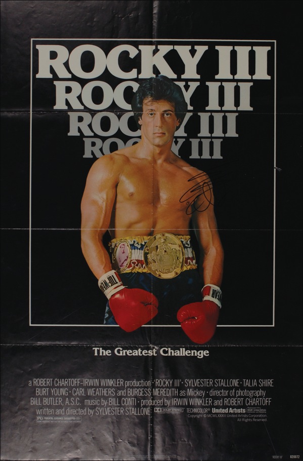 Color 27 x 41 one sheet movie poster for Rocky III, signed in black felt tip. Folded and in fine condition, with some scattered light creasing, mostly along storage folds. R&R COA.