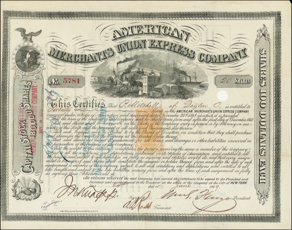 Businessman (1818–1881) who cofounded the famous express firm Wells, Fargo & Co., served as president of American Express, and later directed the New York Central and Northern Pacific Railways. Handsomely engraved DS, signed “Wm. G. Fargo,” one page both sides, 11.5 x 7.75, June 24, 1869. A certificate for twenty shares of stock in the American Express Company issued to P. Mitchell of Dayton, Ohio. Cancellation hole in blank portion and a few wrinkles, otherwise fine condition. R&R COA.