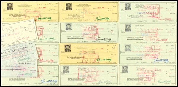 Beloved American entertainer (1898–1979), best known as the clown “Weary Willie.” Fifteen personal checks, 1957–69, each filled out in type and signed by Kelly. In fine condition, with bank stamps touching most signatures, and a few vertical folds. R&R COA.