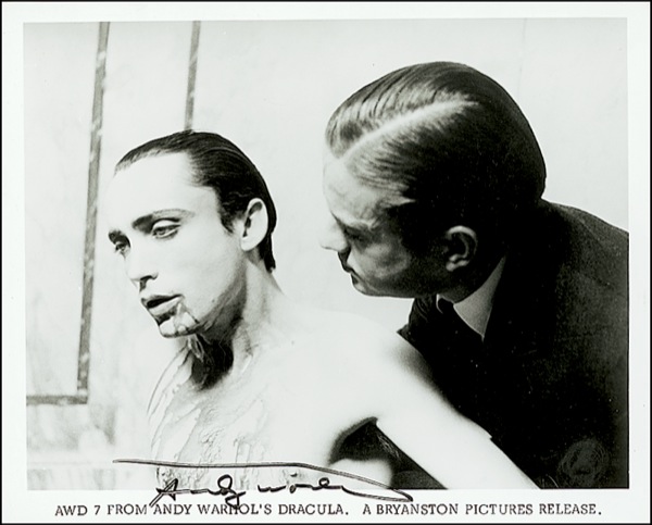 Glossy 10 x 8 publicity still from the film Andy Warhol’s Dracula, signed in black felt tip. In fine condition, with a few scattered dings and surface marks. R&R COA.