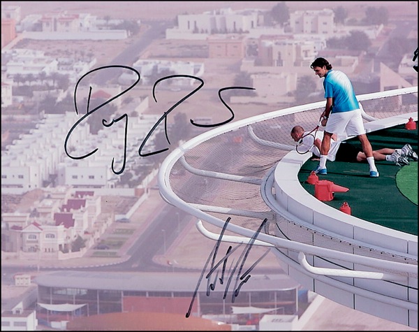 Color glossy 10 x 8 photo of Andre Agassi and Roger Federer peering over the edge of the skyscraper tennis court in Dubai, signed in black felt tip by both. In very fine condition. R&R COA.