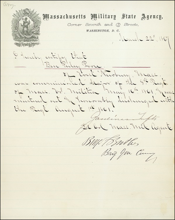 DS, signed “Benj. F. Butler, Brig. Gen. Cmg,” one lightly lined page, 7.75 x 9.75, Massachusetts Military State Agency letterhead, March 22, 1867. Butler signs off on an honorable discharge for Major Ben Perley Poore of the 48th Regiment of the Massachusetts Volunteer Militia stating he “was mustered out and honorably discharged.” In fine condition, with scattered light toning and a few creases. R&R COA.