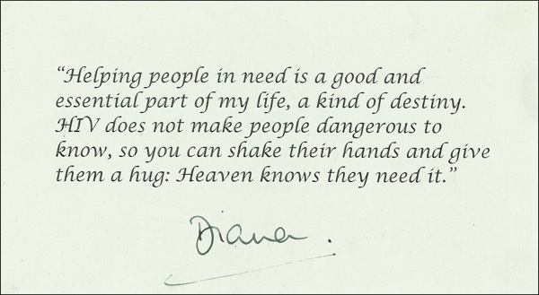 Dark ink signature, “Diana,” on an off-white 8.25 x 4.5 heavy stock album page, to which was later added a printed quote attributed to Diana reading “Helping people in need is a good and essential part of my life, a kind of destiny. HIV does not make people dangerous to know, so you can shake their hands and give them a hug: Heaven knows they need it.” One faint bend, otherwise very fine condition. LOA John Reznikoff/PSA/DNA and R&R COA.