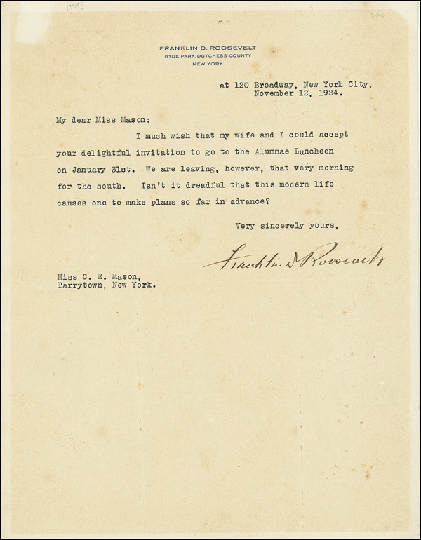 TLS, one page, 8.5 x 11, personal letterhead, November 12, 1924. Roosevelt writes to Miss C. E. Mason in Tarrytown. In full: “I much wish that my wife and I could accept your delightful invitation to go to the Alumnae Luncheon on January 31st. We are leaving, however, that very morning for the south. Isn’t it dreadful that this modern life causes one to make plans so far in advance?” In very good condition, with mild toning from previous framing, faint mailing fold touching one letter of signature, and a few scattered spots and discolorations. LOA John Reznikoff/PSA/DNA and R&R COA.