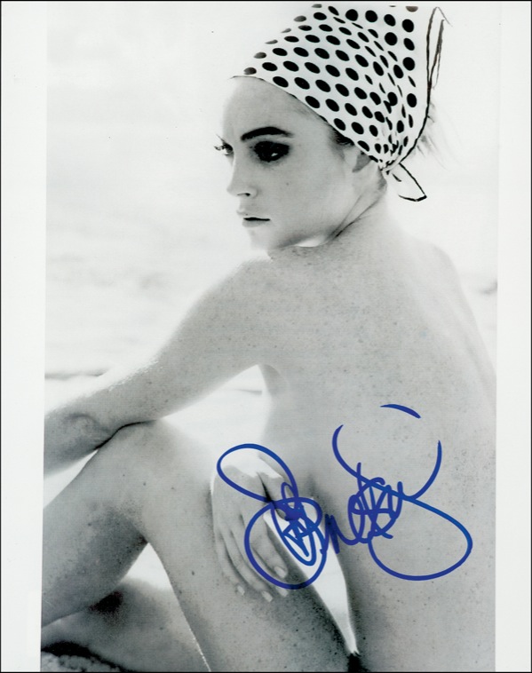 Glossy 8 x 10 photo of a topless Lohan, signed in person in blue felt tip. In fine condition, with a faint bend. According to the consignor, Lohan has recently stopped signing nude and seminude images. R&R COA.