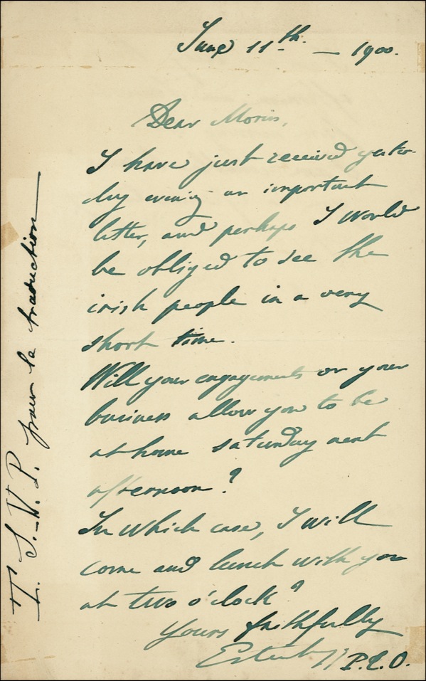 In 1894, Alfred Dreyfus, a Jewish captain in the French army, was tried and convicted for treason on evidence that turned out to be inconclusive at best. One of the key pieces of evidence was a “bordereau,” a list containing French military secrets, that Dreyfus was accused of passing on to the Germans. It was later proven that the actual author of the list was a French infantry major, Ferdinand Walsin Esterhazy (1847–1923), who, despite the damning evidence against him, was allowed to retire to England while Dreyfus languished on Devil’s Island. Discovering the murky circumstances of the case—the recklessness of the French government in pursuing a speedy conviction against Dreyfus, the sloppy procedure of the court-martial—author Emile Zola wrote his famous open letter, “J’Accuse!,” laying bare the entire disgraceful affair. Zola was convicted of libel and fled to England, though he returned to France in time to witness the fall of the government and Dreyfus’ release following an overturned second conviction. Uncommon ALS signed “Esterhazy,” one page, 4.5 x 7, June 11, 1900. Esterhazy writes to Mr. Morin. In full: “I have just received yesterday evening an important letter, and perhaps I would be obliged to see the Irish people in a very short time. Will your engagements or your business allow you to be at home Saturday next afternoon? In which case, I will come and lunch with you at two o’clock.” The integral leaf bears a French translation of the letter in another hand. Accompanied by the original mailing envelope. In fine condition, with light scattered soiling, a few tiny spots of adhesive residue, and notation in another hand along left edge (well away from writing). R&R COA.