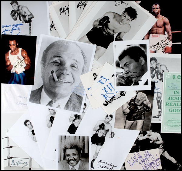 Twenty-five signed items: Is Jesus Really God pamphlet, signed and inscribed on the front by Muhammad Ali; glossy 5 x 7 photos of Ali, signed and inscribed in black felt tip; ballpoint signature of Ali at the bottom of a 1988 TLS to Ali; felt tip signature of Ray ‘Boom Boom’ Mancini on an off-white 5 x 3 card; and twenty-one signed photos, ranging in size from 3.5 x 5.5 up to 8 x 10, each signed in ink or felt tip by the respective boxing figure pictured. Signers include: Willie Pep (5), Gene Tunney, Rocky Graziano (8), Jake LaMotta, Floyd Patterson (3), Sugar Ray Leonard (2), Ingemar Johansson and Don King. In fine overall condition. LOA Steve Grad/PSA/DNA and R&R COA.