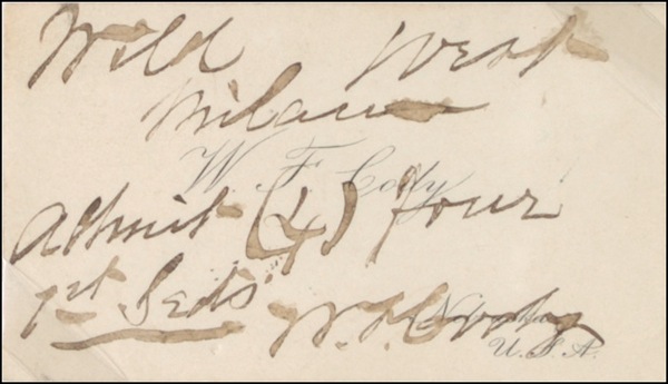 Manuscript pass on his personal calling card, 3 x 1.75, signed in ink, “W. F. Cody.” Cody has written in full: “Wild West Milan, Admit (4) four, 1st seats.” The pass evidently dates to 1889, when Cody’s tour of Europe included a stop in Milan, Italy. Presented with an unsigned period paperstock panoramic photo of his Wild West Show personnel, matted and framed in a bullet-inlaid barnwood frame to an overall size of 32.75 x 15.5. A few subtle blots to writing, otherwise fine condition. R&R COA. Oversized.