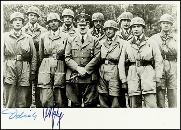 “Impregnable” Belgian fortress manned by 1200 Belgian soldiers during World War II. In 1940, it was captured by approximately 78 glider-borne German troops in just a few hours. Two identical 7 x 5 photos of Hitler posing with some of his officers after the capture of Fort Eben Emael, signed in blue ink by Witzig and Delica. In fine condition. R&R COA.