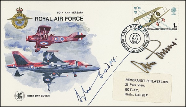 FDC, 6.5 x 3.75, with a cachet honoring Royal Air Force, signed in felt tip by Bader and Galland. In fine condition, with philatelic address label, tiny brush to Bader, and slight haloing to Galland. R&R COA.