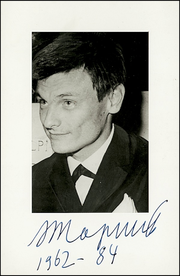Highly regarded Russian director (1932–1986) of such films as My Name Is Ivan, the original Solaris, and Mirror. Glossy 5.5 x 8.5 photo, signed in ink (in Russian) in the blank lower border, Tarkovsky adding, “1962–84.” In very fine condition. R&R COA.