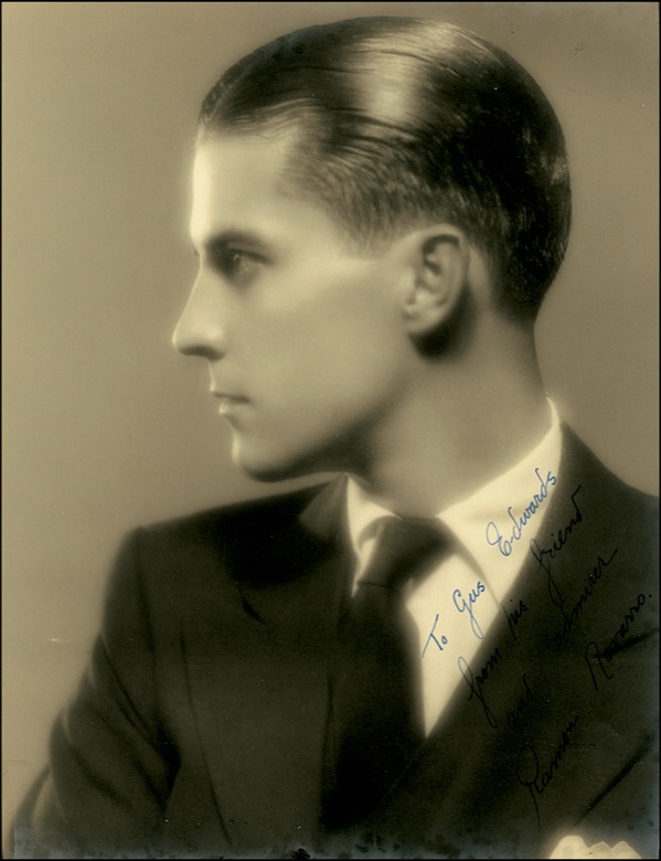 Handsome vintage matte-finish 10 x 13 photo, signed and inscribed in fountain pen “To Gus Edwards from his friend and admirer Ramon Navarro.” Slight marginal trimming, a hint of subtle silvering at edges, and moderate contrast to signature and part of inscription, otherwise fine condition. R&R COA.