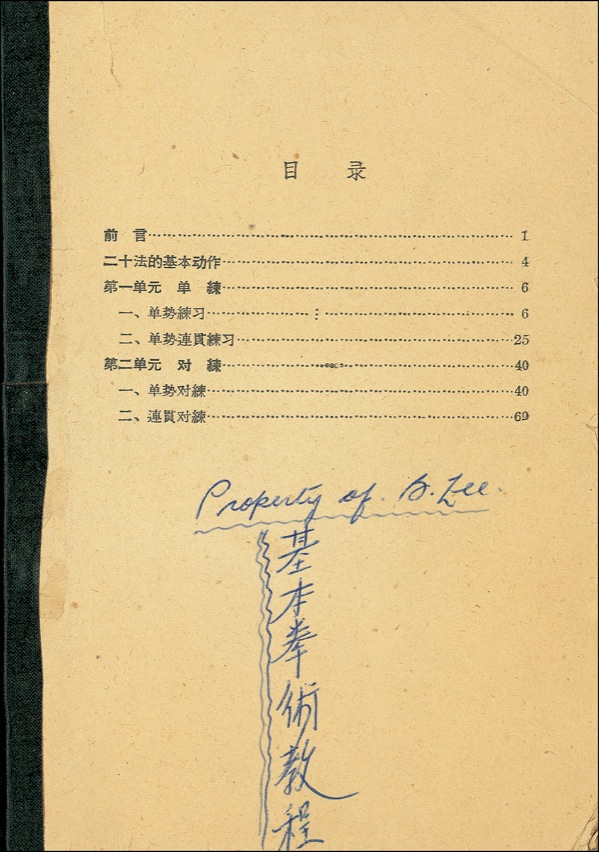 Legendary Chinese-American martial arts artist and actor (1940–1973) whose skill, charisma, and presence afforded martial arts films a new measure of respectability and popularity. His untimely death “by misadventure” sparked all manner of speculation, including rumors of assassination, ancestral curses, and more. Illustrated Chinese-language martial arts instructional book, tape-bound newsprint covers, 5 x 7.25, 86 pages, signed in ballpoint on the front cover, “Property of B. Lee,” Lee adding a column of Chinese characters translating as “Basic Chinese Gung Fu Curriculum”; he has also underlines sevral passages within the text. Though it is difficult to tell, it is possible that the book was originally bound as a conventional softcover; however, it may just as likely have been a “pulp” publication that was produced as inexpensively as possible for the enormous Asian market. In any event, it appears complete and intact. Expected mild toning and a few mild wrinkles, tears, and tiny chips, otherwise fine condition. The writing itself is dark, clear, and otherwise unaffected. PSA/DNA LOA and R&R COA.