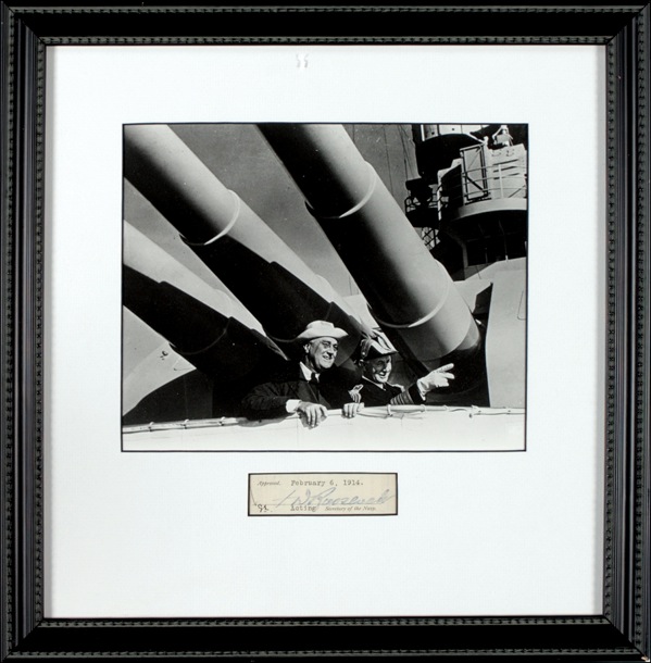 Fountain pen signature, “F. D. Roosevelt,” on an off-white slip, clipped from a larger document signed on February 6, 1914, while serving as the acting Secretary of the Navy. Matted and framed with a photo of Roosevelt aboard a Navy battleship, to an overall size of 15 x 15.5. In fine condition, with an ink and pencil mark to left edge and signature a shade or two light. LOA John Reznikoff/PSA/DNA and R&R COA.