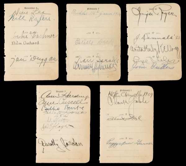 Lot of six leaves from the datebook-style Sir Walter Scott Birthday Book, 2.25 x 3.25, each signed in ink (on one side only) by two or more celebrities near their respective birthdays. The signers include: Carmen Miranda, Ginger Rogers, Helen Chandler, Lupe Velez, Will Rogers, Clark Gable, Peggy Ann Garner, Ann Harding, and Billie Burke. In fine condition, with a hint of mild scattered toning and a few of the signatures slightly touching others. R&R COA.