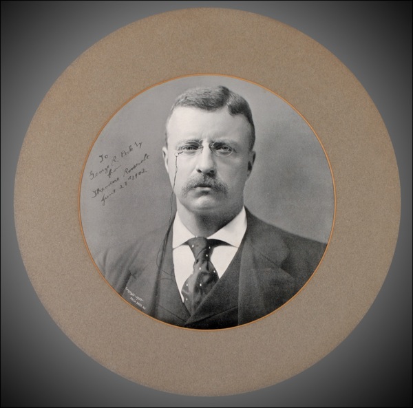 Vintage 12.75 x 12.5 Pach Bros. halftone portrait photo of Roosevelt in a three-piece suit, staring intently into the lens, signed and inscribed in fountain pen as president, “To George R. Peck from Theodore Roosevelt, June 28, 1902.” Photo is housed in its original circular mat and backing, complete with Pach Bros. information printed on reverse. In fine condition, with a separated top right corner, undetectable under mat. In 1902, Roosevelt averted a national emergency when he found a compromise to the anthracite coal strike by the United Mine Workers of America that threatened the heating supplies of most homes. Workers in eastern Pennsylvania were on strike for 163 days before it ended, and they were granted a 10% pay increase and a 9-hour day (from the previous 10 hours). Also in 1902, in response to the assassination of President William McKinley on September 6, 1901, Roosevelt became the first president to be under constant Secret Service protection. Roosevelt’s lasting popular legacy is the stuffed toy bears (teddy bears), named after him following an incident on a hunting trip in 1902. Roosevelt famously refused to kill a captured black bear cub simply for the sake of making a kill. Bears and later bear cubs became closely associated with Roosevelt in political cartoons thereafter. A striking and seldom seen example. LOA John Reznikoff/PSA/DNA and R&R COA.