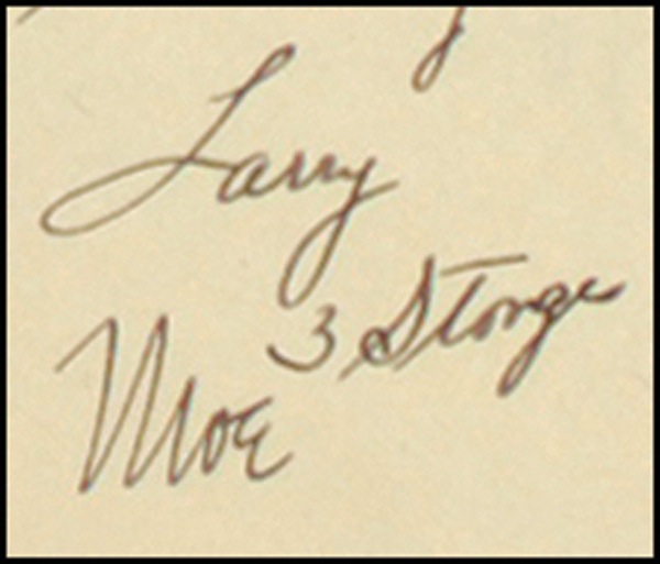 Three vintage ink signatures: “Curly, 3 Stooges,” on a yellow 3 x 2 slip; and “Larry, 3 Stooges” and “Moe” on the same yellow 2 x 1.75 slip. Matted and framed with an unsigned photo to an overall size of 22.5 x 20.5. Faint show-through and tiny spot to blank portion of Curly, otherwise fine, clean condition. PSA/DNA LOA and R&R COA. Oversized.