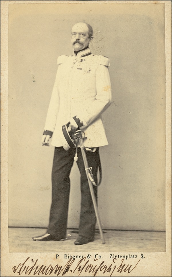 Prussian statesman and First Chancellor of the German Empire. Vintage 2.5 x 4 full-length carte-de-visite photo of Bismarck in uniform by P. Biegner & Company of Berlin (and so marked on reverse), signed along the bottom edge in fountain pen. In fine condition, with a bit of scattered light soiling and collector’s pencil notation on reverse. First Bismarck photo we have ever offered! An opportunity not to be missed. LOA John Reznikoff/PSA/DNA and R&R COA.