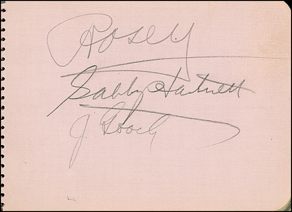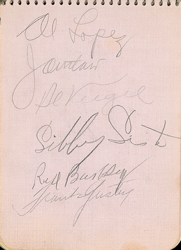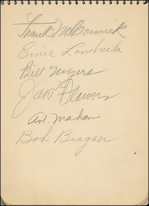 Spiral bound autograph album, 6.25 x 4.25, signed inside by approximately 100 players from the 1939-1940 season. Most have signed in pencil and there are multiple signatures on most pages. Signers include: Willard Hershberger (he committed suicide during the 1940 season!), Gabby Hartnett, Carl Hubbell, Ernie Lombardi, Al Lopez, Wally Berger, Cy Blanton, Hugh Casey, Mort Cooper, F. [Frank] DeMaree, Dutch Dietz, Carl Doyle, Leo Durocher, Jake Flowers, Luke Hamlin, Frank McCormick, Bill Nicholson (2), Don Padgett, Pee Wee Reese, Rosey [Rosewell] (2), Joe Schultz, Enos Slaughter, Johnny Vander Meer, Jim Wasdell and Earl Whitehill. In fine condition, with light wear to covers and some scattered light toning to some pages. R&R COA.