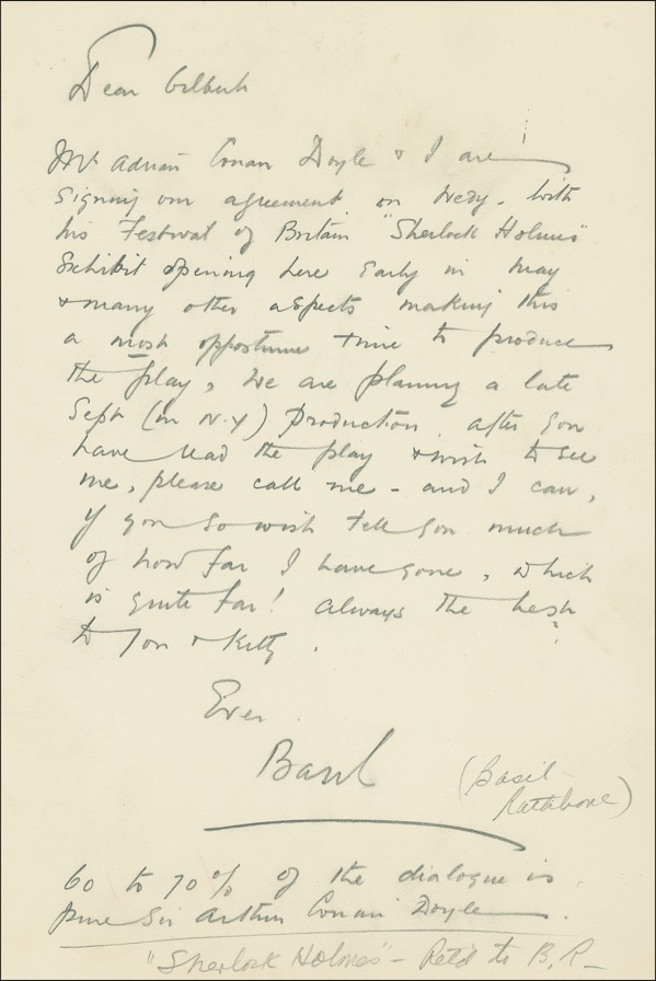 ALS in pencil signed “Basil,” one page, 6.75 x 10, no date [circa 1951]. Rathbone writes to Gilbert [multiple-Tony-winning producer Gilbert Miller, 1884–1970]. In part: “Mr. Adrian Conan Doyle & I are signing our agreement on Wedy. with his Festival of Britain ‘Sherlock Holmes’ Exhibit opening here early in May & many other aspects making this a most opportune time to produce the play, we are planning a late Sept. (in N.Y.) production. After you have read the play & wish to see me, please call me—and I can, if you so wish, tell you much of how far I have gone, which is quite far!...” After signing, Rathbone adds a postscript: “60 to 70% of the dialogue is pure Sir Arthur Conan Doyle.” The exhibition Rathbone mentions, which was presented at the 1951 Festival of Britain, included a “reconstruction” of Holmes’ reading room. The play in question is evidently Sherlock Holmes, adapted from Doyle’s stories by Rathbone’s wife, Ouida. Though Rathbone had already enjoyed tremendous success as Holmes on the screen and the airwaves, the play was a failure, closing after three performance on Broadway in 1953. A few subtle smudges and surface marks and secretarial pencil notations, otherwise fine, crisp condition. R&R COA.