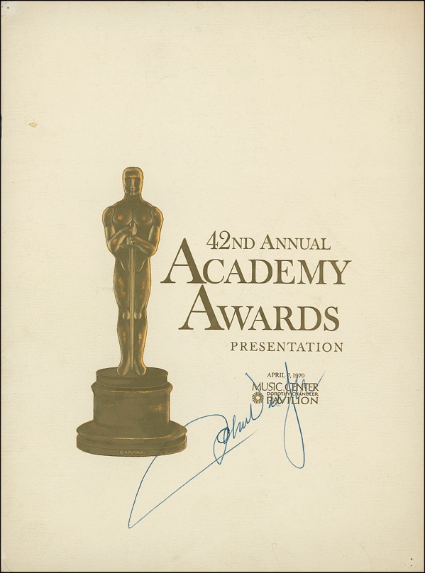 Original program, 9 x 12, from the 42nd Annual Academy Awards held on April 7, 1970. Signed across the front cover in blue ballpoint, “John Wayne.” In fine condition, with diagonal crease to lower right corner of cover, light handling wear and winners marked off inside program. Wayne won the Academy Award for portraying Rooster Cogburn in True Grit. R&R COA.