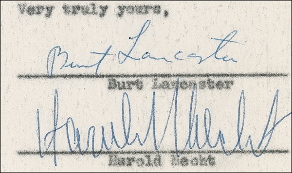 DS, one page, 8.5 x 14, September 16, 1954. Subordination letter sent to Banker’s Trust Company regarding a motion picture entitled Gabriel Horn, which would be renamed The Kentuckian, signed at the bottom in blue ballpoint by Lancaster. A bit of mild toning, a few edge creases and two punch holes to top, otherwise fine condition. R&R COA.